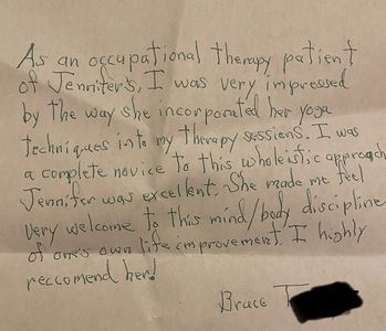 As an occupational therapy patient of Jennifer's I was very impressed by the way she incorporated her yoga techniques into my therapy sessions. I was a complete novice to this wholistic approach. Jennifer was excellent. She made me feel very welcome to this mind/body discipline of one's own life improvement. I highly recommend her!